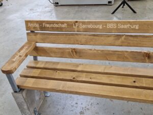 Vergangene Woche trafen sich zwei Schreinerklassen unserer Geschwister-Scholl-Schule und dem lothringischen Sarrebourg im Lycée Labroise zu einem zweitägigen Austausch. Gemeinsam lernten die Schülerinnen und Schüler, die sich im dritten Ausbildungsjahr in der Ausbildung zum Schreiner/ zur Schreinerin befinden, nicht nur die Berufsausbildung im Nachbarland kennen, sondern arbeiteten auch an einem besonderen Projekt: dem Bau einer Sitzbank. Diese wird an einem noch zu bestimmenden Ort in Saarburg aufgestellt werden.